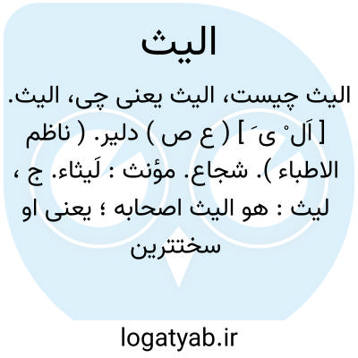الیث. [ اَل ْ ی َ ] ( ع ص ) دلیر. ( ناظم الاطباء ). شجاع. مؤنث: لَیثاء. ج، لیث: هو الیث اصحابه؛ یعنی او سختترین و چابکترین یاران خود است. ( از اقرب الموارد ).