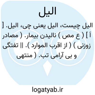 الیل. [ اَ ] ( ع مص ) نالیدن بیمار. ( مصادر زوزنی ) ( از اقرب الموارد ). || تفتگی و بی آرامی تب. ( منتهی الارب ). اضطراب و بی آرامی بسبب تب. ( از ذیل اقرب الموارد ). || بی فرزند گردیدن زن. ( ناظم الاطباء ). ثُکل. ( ذیل اقرب الموارد ). || ( اِ ) ناله. ( منتهی الارب ). انین. ( از ذیل اقرب الموارد ). و گویند: له الویل و الالیل؛ یعنی او را عذاب و ناله و فریاد است. ( منتهی الارب ). || آواز سنگریزه ها و سنگ. || آواز آب. ( منتهی الارب ) ( از ذیل اقرب الموارد ).