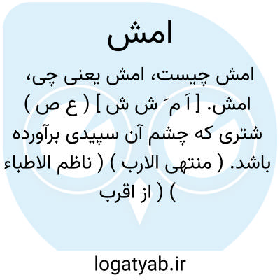 امش. [ اَ م َ ش ش ] ( ع ص ) شتری که چشم آن سپیدی برآورده باشد. ( منتهی الارب ) ( ناظم الاطباء ) ( از اقرب الموارد ). ج، مُش. ( از اقرب الموارد ).