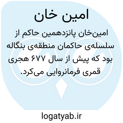 امین‌خان پانزدهمین حاکم از سلسله‌ی حاکمان منطقه‌ی بنگاله بود که پیش از سال ۶۷۷ هجری قمری فرمانروایی می‌کرد. این اطلاعات تاریخی بر پایه‌ی منبع معتبر معجم‌الانساب تألیف زامباور، در جلد دوم و صفحه‌ی ۴۲۶ آن ثبت شده است. دوره‌ی حکمرانی او در بازه‌ی زمانی پیش از قرن هفتم هجری، بخشی از تاریخ پرتحول شبه‌قاره‌ی هند را تشکیل می‌دهد. اگرچه جزئیات دقیقی از اقدامات و دوران زمامداری امین‌خان در دسترس نیست، اما ذکر نام او در کتب انساب، نشان‌دهنده‌ی اهمیت جایگاهش در ساختار حکومتی آن دوران است. ارجاع به چنین منابعی، نقش بسزایی در روشن‌سازی زوایای پنهان تاریخ مناطق مختلف از جمله بنگاله دارد. مطالعه‌ی این دوره می‌تواند در درک بهتر سیر تحولات تاریخی و چگونگی انتقال قدرت در این خطه مؤثر باشد.