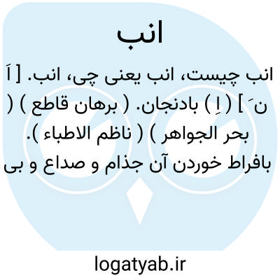 انب. [ اَ ن َ ] ( اِ ) بادنجان. ( برهان قاطع ) ( بحر الجواهر ) ( ناظم الاطباء ). بافراط خوردن آن جذام و صداع و بی خوابی آورد، و بعضی گویند عربی است. ( برهان قاطع ) ( از هفت قلزم ) ( آنندراج ). معرب آن انبج است. ( از معرب جوالیقی ص 43 سطر 24 ). مَغْد. حَیْصَل. حَدَق. و رجوع به بادنجان شود.