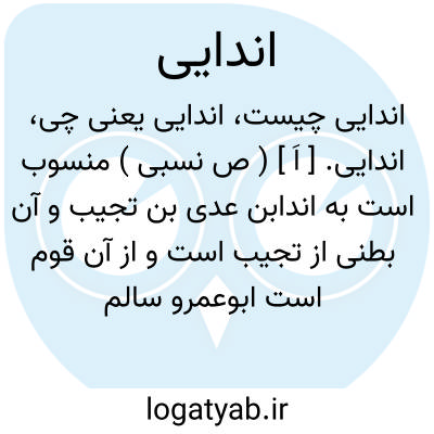 اندایی. [ اَ ] ( ص نسبی ) منسوب است به اندابن عدی بن تجیب و آن بطنی از تجیب است و از آن قوم است ابوعمرو سالم بن غیلان اندایی در گذشته به سال 153 هَ.ق. ( از لباب الانساب ).
