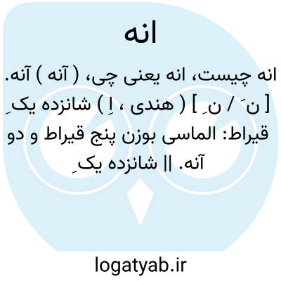 ( آنه ) ( اسم ) ۱ - یک شانزدهم قیراط شانزده یک قیراط: الماسی بوزن سه قیراط و یک آنه. ۲ - یک شانزدهم یک روپیه.