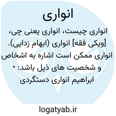 [ویکی فقه] انواری (ابهام زدایی). انواری ممکن است اشاره به اشخاص و شخصیت های ذیل باشد: • ابراهیم انواری دستگردی اصفهانی، از اطبّاء معاصر و مورد احترام قاطبه اهالی اصفهان و معروف به حذاقت و استادی• محمدباقر محیی الدین انواری، از نمایندگان امام خمینی (رحمةالله ) در حج ۱۳۹۹ق./ ۱۳۵۸ش