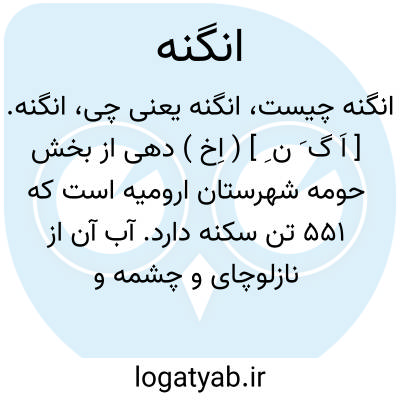 انگنه. [ اَ گ َ ن ِ ] ( اِخ ) دهی از بخش حومه شهرستان ارومیه است که 551 تن سکنه دارد. آب آن از نازلوچای و چشمه و محصول آنجا غلات، توتون، چغندر و حبوب است. ( از فرهنگ جغرافیایی ایران ج 4 ).