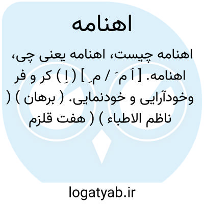 اهنامه. [ اَ م َ / م ِ ] ( اِ ) کر و فر وخودآرایی و خودنمایی. ( برهان ) ( ناظم الاطباء ) ( هفت قلزم ). خویش آرایی و خودآرایی و هوش و بوش. ( فرهنگ شعوری ) ( مؤید الفضلاء ). || هر چیز که زود از دست برود و از انتفاع بازماند و شکسته شود. ( برهان ) ( هفت قلزم ) ( ناظم الاطباء ) ( مؤید الفضلاء ). || دولت. ( ناظم الاطباء ) ( برهان ). || عشق و رسوائی. ( هفت قلزم ) ( برهان ) ( از ناظم الاطباء ) ( مؤید الفضلاء ). رسوایی. ( فرهنگ شعوری ). رسوایی و فضیحت.( آنندراج ) ( انجمن آرا ). شعوری برای معنی رسوایی این دو بیت را از باباطاهر شاهد آورده است: زخم اهنامه مستوران چه دانند اوج دیدار او دونان چه دانند.باباطاهر.شاخ اهنامه بی ما برنگیری ز هر باران صدف گوهر نگیری.باباطاهر.( شعوری ج 1 ورق 131 )لیکن در مجموعه ابیات باباطاهر دیده نشد.