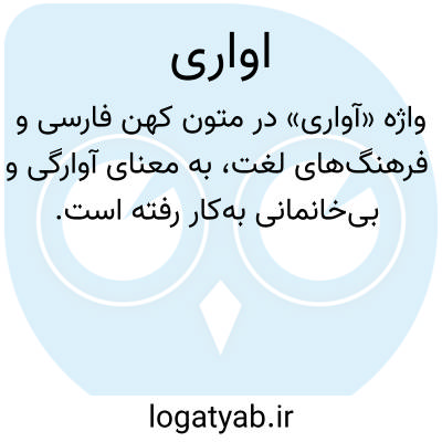 واژهٔ «آواری» در متون کهن فارسی و فرهنگ‌های لغت، به معنای آوارگی و بی‌خانمانی به‌کار رفته است. این معنا بیشتر در توصیف وضعیت انسان‌هایی دیده می‌شود که بر اثر حوادث طبیعی، جنگ، یا نابسامانی‌های اجتماعی، سرپناه و جایگاه ثابت خود را از دست داده‌اند و ناچار به کوچ و سرگردانی شده‌اند. ازاین‌رو، «آواری» بار معنایی اندوه‌بار و اجتماعی دارد و اغلب با مفاهیمی چون بی‌پناهی، دربدری و ناپایداری زندگی همراه است.