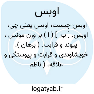 اوبس. [ ب ِ ] ( اِ ) بر وزن مونس، پیوند و قرابت. ( برهان ). خویشاوندی و قرابت و پیوستگی و علاقه. ( ناظم الاطباء ). || خویش و منسوب. ( انجمن آرا ) ( آنندراج ). خویش. ( برهان ).، اﷲ و بس. [ اَل ْ لا هَُ ب َ ] ( اِ مرکب ) خدا و بس. تنها خدا کافی است: