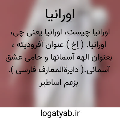 اورانیا. ( اِخ ) عنوان آفرودیته، بعنوان الهه آسمانها و حامی عشق آسمانی.( دایرةالمعارف فارسی ). بزعم اساطیر قدیمه یونان یکی از پریهای موسوم به موسه است که حامیان علوم و معارف و صنایع مستظرفه میباشند، در صورت یک دختر ملبس به لباس آبی و مزین بستاره ها و کواکب تصویرش میکردند و یک کره سما در دست میگرفت. ( قاموس الاعلام ترکی ).