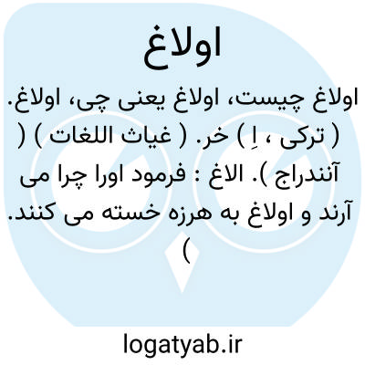 اولاغ. ( ترکی، اِ ) خر. ( غیاث اللغات ) ( آنندراج ). الاغ: فرمود اورا چرا می آرند و اولاغ به هرزه خسته می کنند. ( جامع التواریخ رشیدی ). تا ممر ایلچیان بسبب نشستن اولاغ دورنیفتد. ( جهانگشای جوینی ). || مطلق مرکوب:در بختیاری خان گفت: اولاغی ایاهه؛ ( الاغی می آید ) و دوربینی بدست داشت دوربین را گرفتم و دیدم گفتم الاغ بنظرم نباشد گفت اولاغ پیش ما مطلق مرکوب است از خر و استر و اسب و گاو و اشتر. || پیک، قاصد.
