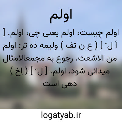 اولم. [ ل َ ] ( اِخ ) دهی است جزء دهستان شاندرمن بخش ماسال شاندرمن شهرستان طوالش. سکنه آن 198 تن و آب آن از چشمه و محصول آن برنج و مختصر ابریشم و گندم است. شغل اهالی زراعت و گله داری است. اکثر سکنه در تابستان به ییلاق دره چاف رود میروند. ( از فرهنگ جغرافیائی ایران ج 2 ).