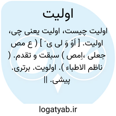 اولیت. [ اَوْ وَ لی ی َ ] ( ع مص جعلی،اِمص ) سبقت و تقدم. ( ناظم الاطباء ). اولویت. برتری. پیشی. || سروری و ریاست. ( ناظم الاطباء ).