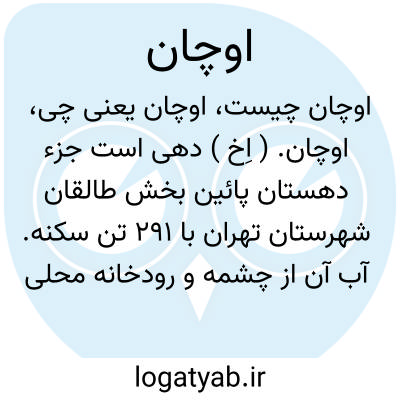 اوچان. ( اِخ ) دهی است جزء دهستان پائین بخش طالقان شهرستان تهران با 291 تن سکنه. آب آن از چشمه و رودخانه محلی شاهرود و محصول آنجا غلات، انگور، گردو، بنشن و شغل اهالی زراعت است. عده ای از سکنه برای تأمین معاش به تهران ومازندران میروند. ( از فرهنگ جغرافیائی ایران ج 1 ).