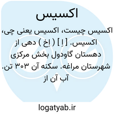 اکسیس. [ اِ ] ( اِخ ) دهی از دهستان گاودول بخش مرکزی شهرستان مراغه. سکنه آن 303 تن. آب آن از رودخانه مردی. محصول عمده آنجاغلات و کشمش و بادام و حبوب و زردآلو. صنایع دستی زنان جاجیم بافی است. ( از فرهنگ جغرافیایی ایران ج 4 ).