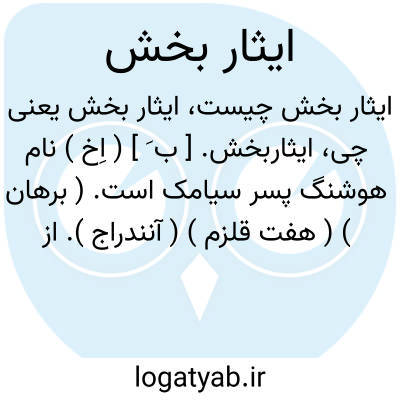 ایثاربخش. [ ب َ ] ( اِخ ) نام هوشنگ پسر سیامک است. ( برهان ) ( هفت قلزم ) ( آنندراج ). از القاب هوشنگ پسر سیامک. ( ناظم الاطباء ).