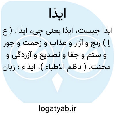ایذا. ( ع اِ ) رنج و آزار و عذاب و زحمت و جور و ستم و جفا و تصدیع و آزردگی و محنت. ( ناظم الاطباء ). ایذاء: