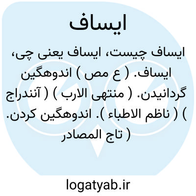 ایساف. ( ع مص ) اندوهگین گردانیدن. ( منتهی الارب ) ( آنندراج ) ( ناظم الاطباء ). اندوهگین کردن. ( تاج المصادر بیهقی ). || در خشم آوردن. ( منتهی الارب ) ( آنندراج ) ( تاج المصادر بیهقی ). به خشم آوردن. ( از ترجمان القرآن ترتیب عادل بن علی ص 24 ) ( ناظم الاطباء ) ( تاج المصادر بیهقی ) ( از اقرب الموارد ).
