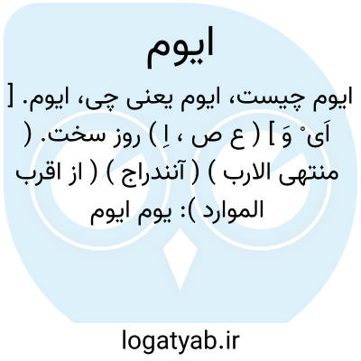 ایوم. [ اَی ْ وَ ] ( ع ص، اِ ) روز سخت. ( منتهی الارب ) ( آنندراج ) ( از اقرب الموارد ): یوم ایوم؛ روز سخت. ( از ناظم الاطباء ). || آخر روز در هر ماه. ( منتهی الارب ) ( از اقرب الموارد ). || روز بسیار روشن. ( ناظم الاطباء ).