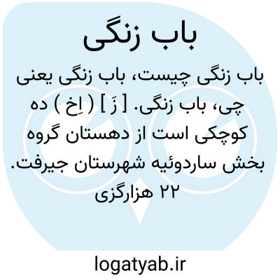 باب زنگی. [ زَ ] ( اِخ ) ده کوچکی است از دهستان گروه بخش ساردوئیه شهرستان جیرفت. 22 هزارگزی شمال ساردوئیه 8 هزارگزی باختر راه مالرو ساردوئیه به راین. سکنه آن 35 تن. ( فرهنگ جغرافیائی ایران ج 8 ).