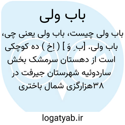 باب ولی. [ب ِ وَ ] ( اِخ ) ده کوچکی است از دهستان سرمشک بخش ساردوئیه شهرستان جیرفت در 38هزارگزی شمال باختری ساردوئیه و 12هزارگزی شمال راه مالرو بافت به ساردوئیه.سکنه آن 7 تن است. ( فرهنگ جغرافیائی ایران ج 8 ).