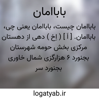 باباامان. [ اَ ] ( اِخ ) دهی از دهستان مرکزی بخش حومه شهرستان بجنورد 6 هزارگزی شمال خاوری بجنورد سر راه شوسه بجنورد به قوچان. جلگه معتدل. سکنه آن 177 تن. شیعه، کردی. آب آن از رودخانه و چشمه و محصول آنجا غلات بنشن و شغل اهالی زراعت و قالی بافی است. راه ماشین رو دارد چشمه معروف باباامان در این ده است. ( فرهنگ جغرافیائی ایران ج 9 ).
