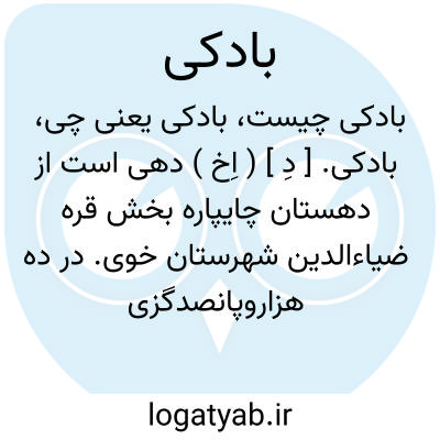 بادکی.[ دِ ] ( اِخ ) دهی است از دهستان روضه چای بخش حومه شهرستان ارومیه. در چهارهزاروپانصدگزی شمال باختری ارومیه و سه هزارگزی باختر شوسه ارومیه به سلماس در جلگه واقع است. هوایش معتدل و دارای 131 تن سکنه می باشد. آبش از شهرچای و محصولش غلات، توتون، حبوبات و انگور. و شغل مردمش زراعت و صنایعدستی اهالی جوراب بافی و راهش مالرو است. ( ازفرهنگ جغرافیائی ایران ج 4 ).