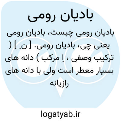 بادیان رومی. [ ن ِ ] ( ترکیب وصفی، اِ مرکب ) دانه های بسیار معطر است ولی با دانه های رازیانه غالباً مخلوط میشود. دانه های رازیانه دارای هشت شیار و دانه های انیسون که معمولاً آنرا بادیان رومی میگویند دارای ده شیارند ( بادیان ختائی غیر از آنست ). ( از گیاه شناسی گل گلاب ص 235 ). اَنیسون. ( فهرست مخزن الادویه ). حب الحلوه. رجوع به انیسون شود.