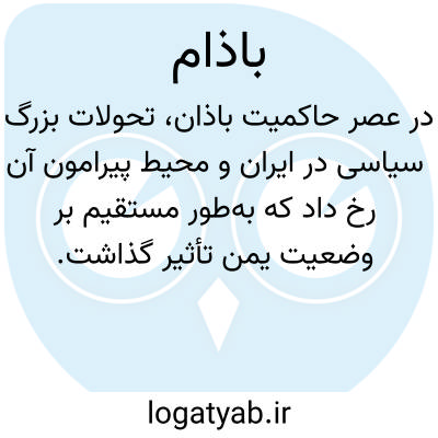 [ویکی فقه] باذام یا باذان، فرزند ساسان جَرون، آخرین حکمران ایرانی یمن که بعد از وَهْرِز و فرزندش و دو تن از احفاد او به فرمان خسرو انوشیروان، به حکومت عدن، صنعا و حوالی آن و قسمتی از جنوب شبه جزیره عربستان برگزیده شد و سرداری ابناء یا ابناء احرار را نیز برعهده داشت.