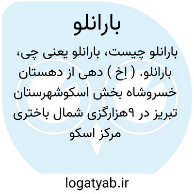 بارانلو. ( اِخ ) دهی از دهستان خسروشاه بخش اسکوشهرستان تبریز در 9هزارگزی شمال باختری مرکز اسکو و2هزارگزی شوسه تبریز به اسکو در جلگه واقع است. هوایش معتدل و 270 تن سکنه دارد. آبش از آجی چای و چشمه و محصولش غلات، بادام و شغل مردمش زراعت و گله داری وراهش مالرو است. ( از فرهنگ جغرافیائی ایران ج 4 ).