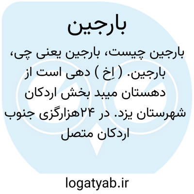 بارجین. ( اِخ ) دهی است از دهستان میبد بخش اردکان شهرستان یزد. در 24هزارگزی جنوب اردکان متصل براه فرعی بارجین به میبد و اردکان در جلگه واقع است. هوایش معتدل و دارای 456 تن سکنه میباشد. آبش از قنات و محصولش غلات،شغل مردمش زراعت و صنایع دستی زنانش کرباس بافی و راهش ماشین رو است. ( از فرهنگ جغرافیائی ایران ج 10 ).
