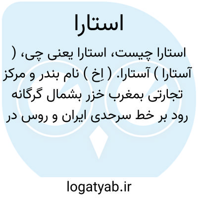 ( آستارا ) آستارا. ( اِخ ) نام بندر و مرکز تجارتی بمغرب خزر بشمال گرگانه رود بر خط سرحدی ایران و روس در 37هزارگزی جنوب لنکران، در مصب رودی به همین نام، موقف کشتی های بازرگانی، دارای پست خانه و تلگرافخانه و مدرسه و بیمارخانه، در 173300گزی طهران و 281000گزی تبریز. پیشتر این بندر جزو تقسیمات ایالت آذربایجان بود وامروز جزو ولایت گیلان است. این شهر را رود آستارا بدو بخش میکند، بخش شمالی آستارای روس و جنوبی آستارای ایران است. و شیلات این بندر و نواحی آن بسیار مهم وذیقیمت است. || آستارا و گرگانرود. یکی از تقسیمات نوزده گانه رشت. مرکز آن شهر ریگ که آن راگرگانه رود نیز گویند، و دارای معادن ذغال سنگ است.