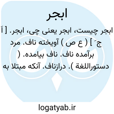 ابجر. [ اَ ج َ ] ( ع ص ) آویخته ناف. مرد برآمده ناف. ناف بیامده. ( دستوراللغة ). درازناف. آنکه مبتلا به بجره است. مرد برآمده ناف و کلان شکم. مؤنث: بَجْراء. ج، بُجْر، بُجْران. || ( اِ ) رسن کشتی. || ( اِخ ) نام مردی.، ( آب جر ) آب جر. [ ج َ ] ( اِ مرکب ) جزر. مقابل مد.