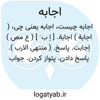 ( اجابة ) اجابة. [ اِ ب َ ] ( ع مص ) اِجابت. پاسخ. ( منتهی الارب ). پاسخ دادن. پتواز کردن. جواب دادن. ( وطواط ). || قبول کردن ( دعا و دعوت و خواهش ). برآوردن. روا کردن. پذیرفتن. اِنجاح. اسعاف: اجاب اﷲ دعاؤه. ( منتهی الارب ). و اجابت کرد و مهیا شد امیرالمؤمنین از برای ایستادگی در آن کاری که به او حواله نمود خدا. ( تاریخ بیهقی ). و آنچه درخواست است، و بفراغ دل وی بازگردد بتمامی درخواهد چه بدان اجابت باشد. ( تاریخ بیهقی ). بوالقاسم علی نوکی صاحب برید غزنین ازخواجه بونصر مشکان درخواست تا فرزندان وی را بدیوان رسالت آورد... بونصر او را اجابت کرد. ( تاریخ بیهقی ). امیر [ منوچهربن قابوس ] رسولان و نامه ها پیوسته کرد... و چنان خواست که میان ما عهدی باشد، ما او را اجابت کردیم. ( تاریخ بیهقی ). باید که این دو کریمه از خاتونان باشند کریم الطرفین، اگر بیند خان ما را بدین اجابت کند. ( تاریخ بیهقی ). امّا چنان باید که هرچه بدان اجابتی کنی غضاضتی بجای ملک بازنگردد. ( تاریخ بیهقی ). مقرر گردد چون ما را بدین اجابت کرده آید آنچه او التماس کند اجابت تمام فرمائیم. ( تاریخ بیهقی ). و چون اجابت کند و دانم که کند... روز دیگر وعده ای بستانی. ( تاریخ بیهقی ). و درخواستند تا به پیغام سخن گویند و اجابت یافتند. ( تاریخ بیهقی ). و قاضی قضاتی ری و آن نواحی را خواسته [ قاضی بوالحسن پسر قاضی بوالعباس ] و اجابت یافته. ( تاریخ بیهقی ). و همیشه وی را [ افشین را ] از ما [ معتصم ] اجابت این بود که او را بر بودلف... گشاده کنیم دست او را. ( تاریخ بیهقی ). هیچ اجابت نمیکردم من او را [ افشین را ]. ( تاریخ بیهقی ). اگر ما [ معتصم ] دوش پس از الحاح که کردی [ افشین ] ترا اجابتی کردیم در باب قاسم... ( تاریخ بیهقی ). محمّد... بسیار حیلت کرد تا این مقدّم نزدیک وی رود البته اجابت نکرده بود. ( تاریخ بیهقی ). سوی وی قریب پنجاه و شصت پیغام رفت، البته اجابت نکرد. ( تاریخ بیهقی ). و ایشان زهره نداشتند که جواب جزم دادندی و درخواستند تا به پیغام سخن گویند و اجابت یافتند. ( تاریخ بیهقی ). تلطفها کرد تا بصلح اجابت کرد. ( تاریخ بیهقی ). هرچه خواسته بود و التماس نموده ازاین شرایط قبول نمود و اجابت کرد. ( تاریخ بیهقی ).