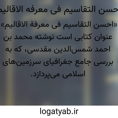 [ویکی نور] احسن التقاسیم فی معرفه الاقالیم (ترجمه). احسن التقاسیم فی معرفه الاقالیم، نام کتاب جغرافیای عربی بسیار مشهوری از اواخر قرن چهارم هجری (دهم میلادی) است که محمد بن احمد بن ابی بکر بناء شامی مقدسی آن را در سال 375 هجری تألیف کرده است و در عصر حاضر به فارسی ترجمه گشته است.