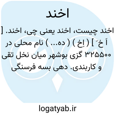 اخند. [ اَ خ َ ] ( اِخ ) ( ده... ) نام محلی در 325500 گزی بوشهر میان نخل تقی و کاربندی. دهی بسه فرسنگی مشرق عسلویه.