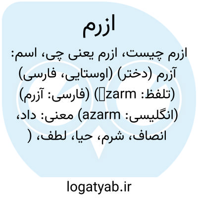 ( آزرم ) (زَ ) [ په. ] ( اِ. )۱ - داد، انصاف.۲ - شرم، حیا. ۳ - رفق، مدارا. ۴ - شفقت، رحم. ۵ - حرمت، عزت. ۶ - مهر و محبت. ۷ - طرف - داری، جانب داری، رودربایستی.۸ - فضیلت، تقوی. ۹ - یاد، ذکر. ۱٠ - اندیشه، دل مشغولی. ۱۱ - تاب، طاقت. ۱۲ - سلامت،