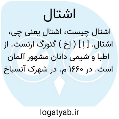 اشتال. [ اِ ] ( اِخ ) گئورگ ارنست. از اطبا و شیمی دانان مشهور آلمان است. در 1660 م. در شهرک آنسباخ تولد یافته و در سنه 1734 م. در برلن درگذشته است. کتابهای بسیار درباره طب و کیمیا و حکمت و فلسفه و زبان لاتن نوشته است. بیشتر شهرت و آوازه وی مرهون افکار فلسفی و معلومات شیمی او است که اختصاص به وی داشته است و نیز پاره ای از احوال را منبعث از تأثیر روح دانسته و آنها را مایه اعتراض بر مادیون قرار داده وحرارت حاصل از احتراق و تنفس را به جسمی مفروض که آنرا فلوحستیق ( ماده شعله ) می نامید، منتسب میساخت، واین فکر را مدت درازی در اروپا پی جوئی میکردند. گرچه عاقبت به جائی نرسید و معلوم شد که فکری واهی بیش نیست، اما باز راه اکتشافاتی برای لاوازیه باز کرد.