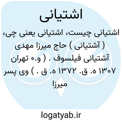 ( آشتیانی ) حاج میرزا مهدی آشتیانی فیلسوف. ( و.٠ تهران ۱۳٠۷ ه. ق. ۱۳۷۲ ه. ق. ) وی پسر میرزا جعفر آشتیانی که خود از اجله علمای عصر خویش و جامع علوم معقول و منقول محسوب میشد و برادر زاده میرزا حسن آشتیانی معروف بود. تالیفات آن مرحوم که اکثر چاپ نشده بیش از ۷٠ جلد است. وی در تالیفات چاپ ابن سینا تبحر داشت و بر اسفار ملا صدرای شیرازی حاشیه ای بزبان عربی و شرحی به زبان فارسی نوشته است. نیز حاشیه ای بر منظومه حاج ملا هادی سزواری و شرحی بر مفتاح الغیب صدر الدین قونوی نگاشته که عرفان محض است.
