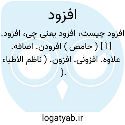 افزود. [ اَ ] ( حامص ) افزودن. اضافه. علاوه. افزونی. افزون. ( ناظم الاطباء ).