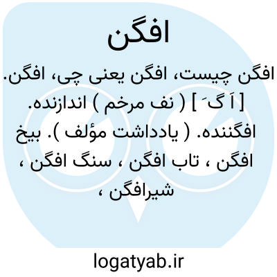 افگن. [ اَ گ َ ] ( نف مرخم ) اندازنده. افگننده. ( یادداشت مؤلف ). بیخ افگن، تاب افگن، سنگ افگن، شیرافگن، کوه افگن، بساطافگن، بارافگن، پرتوافگن، پس افگن، پلنگ افگن، پیل افگن، خصم افگن، دست افگن، زورافگن، رمزافگن، سایه افگن و سرافگن از ترکیب آن مستعمل است. ( آنندراج ). || ( فعل امر ) امر افگندن. ( آنندراج ).