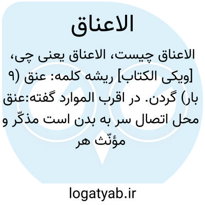 گردن. در اقرب الموارد گفته:عنق محل اتصال سر به بدن است مذکّر و مؤنّث هر دو آید مذکّر بودن اکثر است جمع آن اعناق می‏باشد.. دست را به گردنت بسته نکن(در انفاق تقتیرنکن). در آیه. مراد از «فَوْقَ الْاَعْناقِ» ظاهراً سرهات که بالای گردن قرار گرفته‏اند.. راغب گوید به اشراف ناس اعناق القوم گویند و اعناق در آیه به معنی اشراف است. طبرسی آن را یکی از چند احتمال شمرده. ولی ظهور آیه می‏رساند که اعناق به معنی گردنهاست و خضوع اعناق عبارت اخرای خضوع صاحبان اعناق است و خضوع شامل همه است نه فقط برای اشراف می‏باشد.