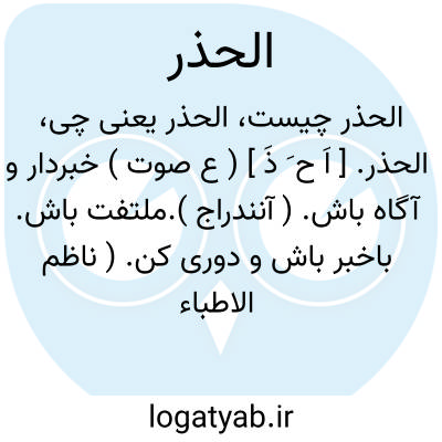 حذر، بپرهیز، بترس، دوری کن، در مقام بیم دادن و امر به پرهیز کردن از کاری یا چیزی یا کسی گفته می شود: ای رخ چون آینه افروخته / الحذر از آه من سوخته (سعدی۲: ۵۴۹ ).