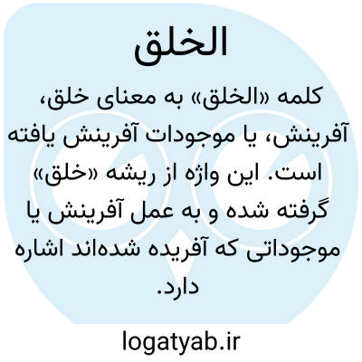 کلمه‌ی «الخلق» در فارسی و عربی به معنای خلق، آفرینش، یا موجودات آفرینش یافته است. این واژه از ریشه «خَلَقَ» گرفته شده و به عمل آفرینش یا موجوداتی که آفریده شده‌اند اشاره دارد. در متون دینی و قرآنی، «الخلق» معمولاً به همه مخلوقات خداوند، اعم از انسان‌ها، حیوانات، گیاهان و جهان هستی گفته می‌شود و بیانگر قدرت، حکمت و توانمندی آفریدگار است. در فلسفه و کلام اسلامی، «الخلق» به مفهوم پیدایش و هستی‌بخشی به موجودات نیز تعمیم داده می‌شود و تفکر درباره آن موجب شناخت بهتر خداوند و نظم خلقت می‌گردد. کاربرد این واژه در متون اخلاقی، فلسفی و عرفانی برای تبیین نسبت انسان با خدا و دیگر مخلوقات اهمیت دارد. هم‌معنی‌های آن شامل آفرینش، مخلوقات، موجودات و طبیعت می‌شود.