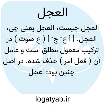 العجل. [ اَ ع َ ج َ ] ( ع صوت ) در ترکیب مفعول مطلق است و عامل آن ( فعل امر ) حذف شده. در اصل چنین بود: اعجل العجل؛ یعنی زودی بکن زودی کردن، یعنی کمال زودی کن. ( از غیاث اللغات ) ( از آنندراج ). بشتاب. عجله کن. اَلبِدار. اَلوَحی ̍. و رجوع به عَجَل شود.