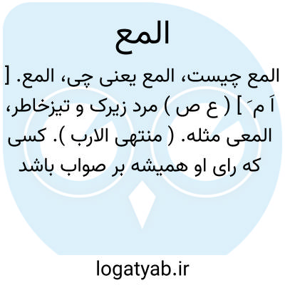 المع. [ اَ م َ ] ( ع ص ) مرد زیرک و تیزخاطر، المعی مثله. ( منتهی الارب ). کسی که رای او همیشه بر صواب باشد و در فکر او خطا نیفتد و ناپرسیده از فراست خود معلوم کند، و مرد تیزخاطر و روشن خرد. ( آنندراج ).