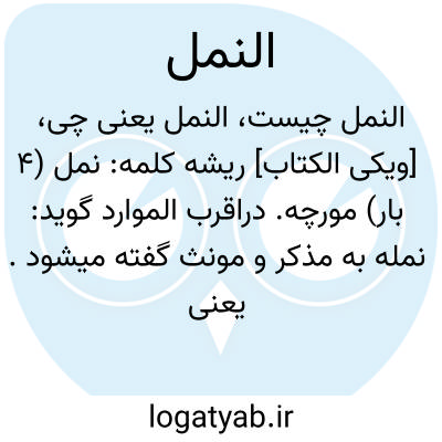 مورچه. دراقرب الموارد گوید: نمله به مذکر و مونث گفته می‏شود. یعنی برای سلیمان لشکریانش از جن و انس و پرندگان جمع شدند و آنها را از تفرق منع می‏کردند. تا چون به بیابان مورچگان آمدندمورچه‏ای گفت: ای جماعت مورچگان به لانه‏های خود وارد شوید تا سلیمان و لشکریانش شمارا پامال نکنند آنها توجهی به شما ندارند سلیمان از شنیدن کلام مورچه به تعجب شد و لبخند زد. از این آیه چند مطلب بدست می‏آید. 1- مورچگان با هم سخن گویندو مافی الضمیر خویش را به همدیگر بیان می‏دارند«قالَتْ نَمْلَهٌ یاأَیُّهاَالَّنمْلُ...». 2- اگر نملة مونث باشد می‏توان پی برد که ملکه مورچگان همانطور که عهده دار تخم گذاری است بر مورچگان حکومت نیز دارد که دستور دخول به لانه‏ها را صادر کرده است و نیز روشن می‏شود که مورچگان تشکیلات اجتماعی و حکومت دارند. 3- بالاتر از همه اینکه مورچگان انسانها را می‏شناسند زیرا مورچه به مورچگان دیگر گفت: اگر داخل لانه‏ها نشوید سلیمان و لشکریانش شما را پامال می‏کنند پس آن مورچه سلیمان و لشکریانش را می‏شناخته است امروز با آنکه کتابها در باره زندگی مورچگان نوشته‏اند و در شناخت اسرار آن زحمتها کشیده‏اند هنوز به آن پایه نرسیده‏اند که قرآن مجید گفته است. 4- سلیمان «علیه السلام» از سخن مورچه با خبر شده و تبسم و تعجب کرده است. *** انمله: سرانگشت. بقولی بند آخر انگشت. جمع آن انامل و انملات است. چون خلوت کنند از غیظ بر شما سرانگشتان بجوند. در مجمع گفته: اصل آن از نمل است سرانگشت تشبیه شده به مورچه در کوچکی و حرکت. نمل (بروزن کتف) سخن چین را گویند که اقوال را در پنهانی از این به آن نقل می‏کند مانند مورچه که در پنهانی قوت بسیارنقل می‏کند.