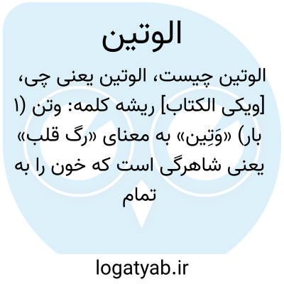 . راغب گوید: وتین رگی است که جگر را آب (خون) می‏دهد اگر آن بریده شود انسان می‏میرد موتون به معنی مقطوع الوتین است. در اقرب الموارد گوید: آن رگی است در قلب درصورت قطع شدن انسان خواهد مرد و از ابن سیده نقل کرده: رگی است چسبیده به قلب از باطن که خون را به همه رگها می‏رساند و آن نهر بدن است (شریان). یعنی اگر پیامبر ازخود چیزی جعل کرده و به ما نسبت دهد از دست راستش گرفته و شریانش را قطع می‏کنیم. گرفتن از دست راست ظاهرا اشاره به اذلال است چنانکه از دست مجرم می‏گیرند. آیه تهدید شدیدی است نسبت به حضرت رسول «صلی الله علیه واله» در صورت جعل چیزی از جانب خودش. این لفظ فقط یکبار در قرآن مجید آمده است.