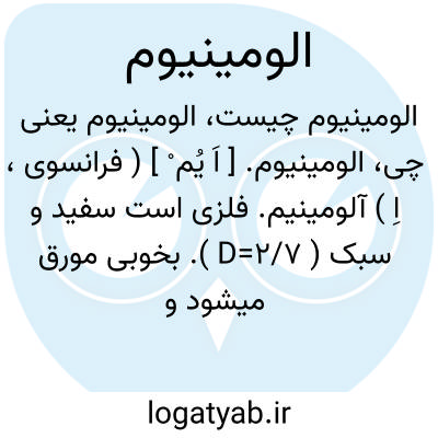( آلومینیوم ) ( اسم ) فلزیست سفید و سبک بخوبی مورق میگردد. و مفتولهای بسیار نازک از آن میتوان ساخت. در ۶۶٠ درجه حرارت ذوب میگردد و در ۶٠٠ درجه نرم میشود و چون در هوا سطحش از یک ورقه اکسید آلومینیوم پوشیده میشود که بقیه را حفظ میکند جزو فلزات فساد ناپذیر محسوب میگردد.