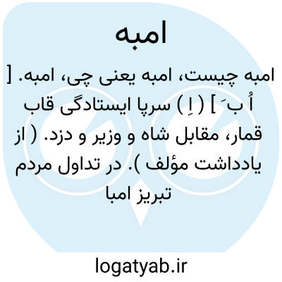 امبه. [ اُ ب َ ] ( اِ ) سرپا ایستادگی قاب قمار، مقابل شاه و وزیر و دزد. ( از یادداشت مؤلف ). در تداول مردم تبریز امبا گویند.