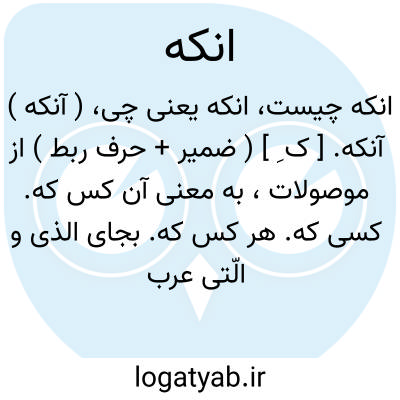 ( آنکه ) آنکه. [ ک ِ ] ( ضمیر + حرف ربط ) از موصولات، به معنی آن کس که. کسی که. هر کس که. بجای الذی و الّتی عرب: